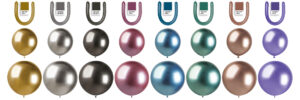 Each palette can be translated into balloon installations, table décor, arches, garlands, and backdrops. Combining matte and chrome finishes, layering sizes, and mixing textures helps bring these color stories to life.