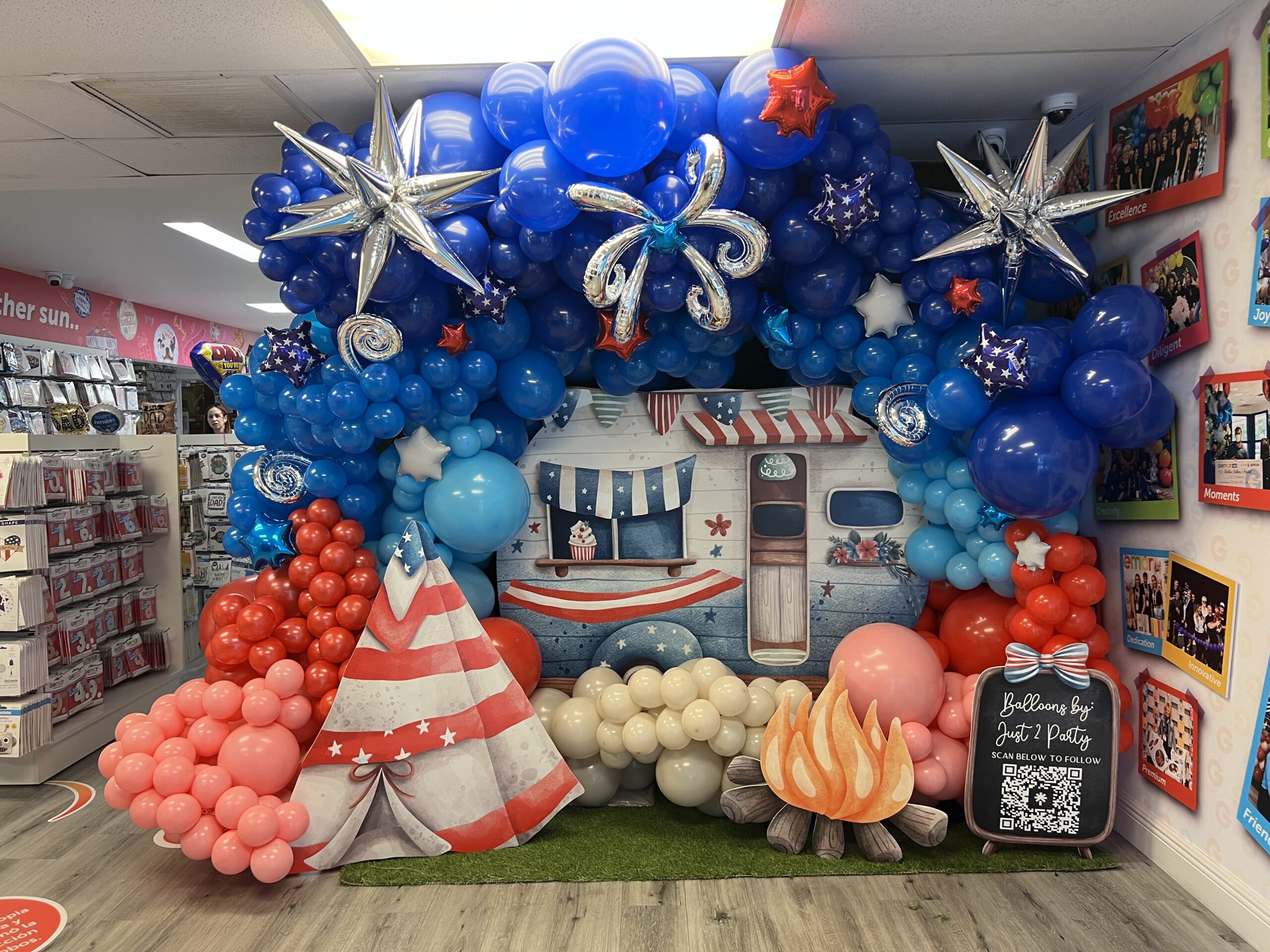 Create balloon columns in red, white, and blue that mimic the look of fireworks bursting in the sky. Top them with star-shaped foils for a dynamic and patriotic effect — great for both indoor and outdoor use.