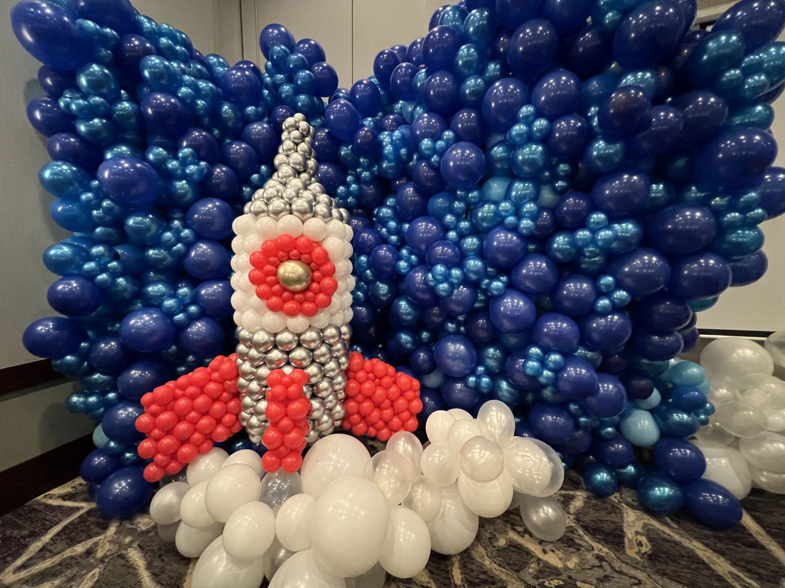 - Rocket Column: stacked metallic balloons in red, white and silver with a foil rocket topper — simple and dramatic.